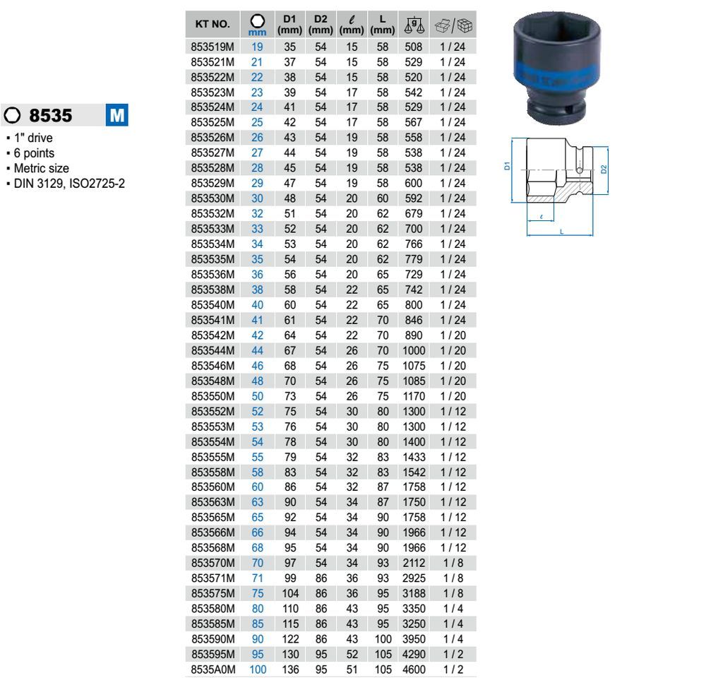 Khẩu tuýp 1″ Kingtony 853571M – 71mm, 6 cạnh, Đen, Dài 93mm